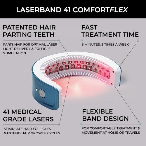 The LaserBand 41 provides a safe, effective and easy to use hair regrowth treatment. The light-weight, flexible band design adjusts to fit most head sizes for a very comfortable treatment. The patented soft touch teeth part your hair during treatment to allow the maximum amount of energizing light to reach your follicles for optimal hair growth results. Treat your entire scalp in as little as 3 minutes, 3 times a week.